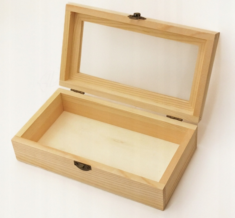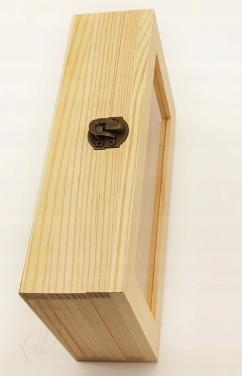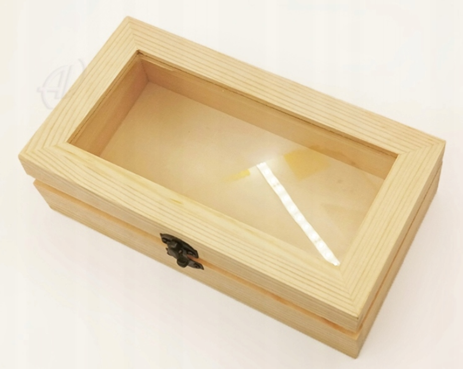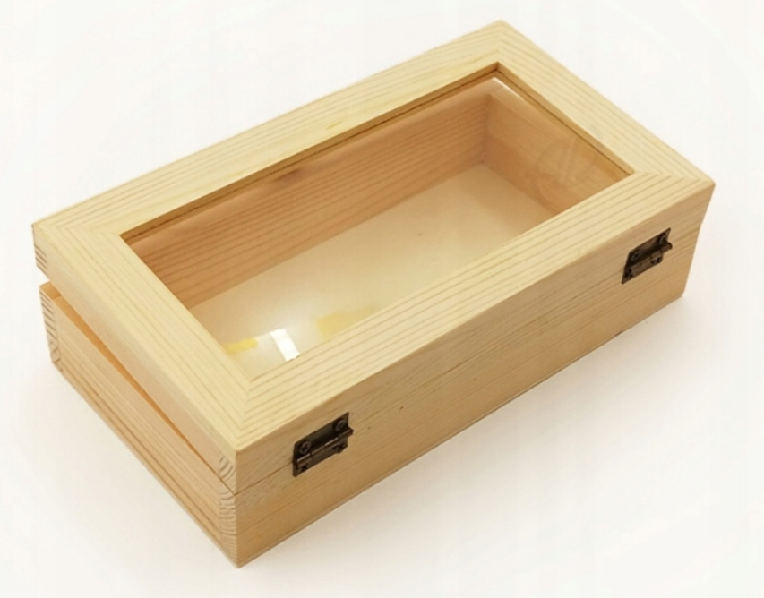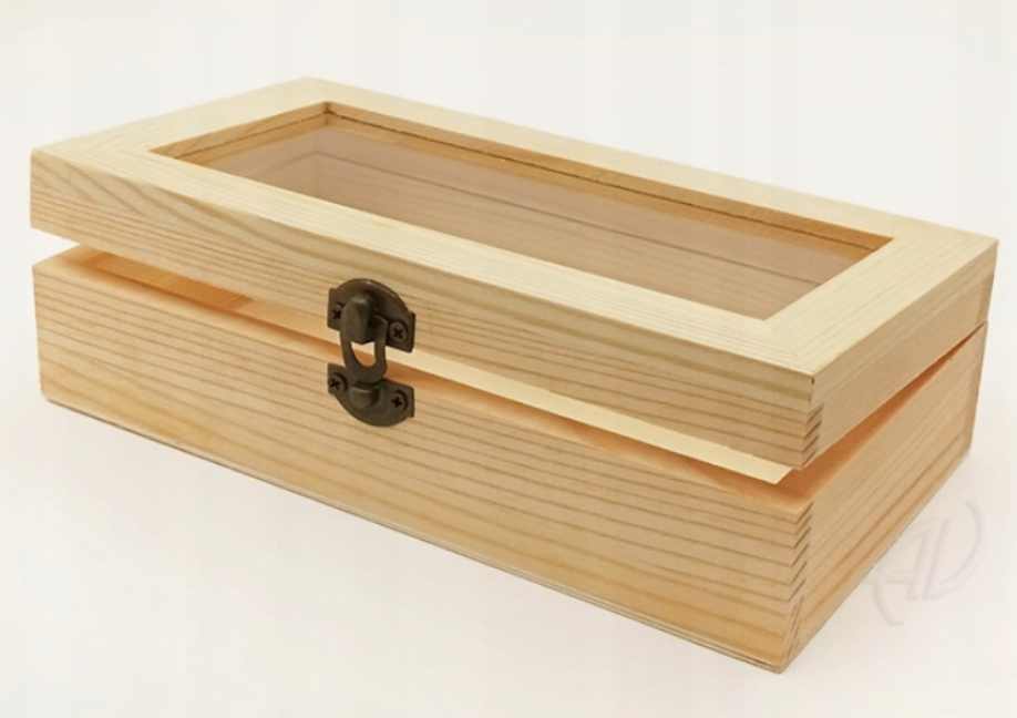 Forma pudełka - szkatułka z zamkiem i okienkiem, może posłużyć do przechowywania rozmaitych drobiazgów, jako gablotka, po ozdobieniu idealna na prezent.