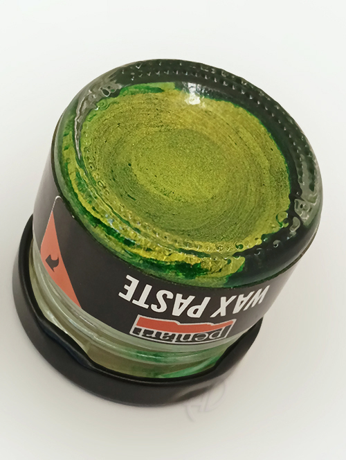 Pasta woskowa, z metalicznym połyskiem, nadaje jasnym powierzchniom żywy, metaliczny połysk, z woskiem pszczelim i olejkiem pomarańczowym.