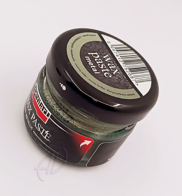 Pasta woskowa, z metalicznym połyskiem, nadaje jasnym powierzchniom żywy, metaliczny połysk, z woskiem pszczelim i olejkiem pomarańczowym.