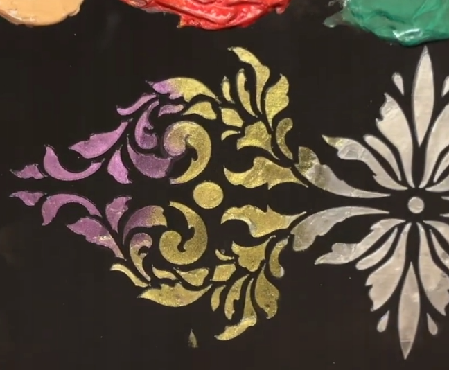 gęsta pasta zawierająca kolorowe metaliczne lub opalizujące pigmenty doskonale nadaje się do tworzenia jasnych, kolorowych, trójwymiarowych dekoracji; opalizujący efekt jest lepiej widoczny na ciemnych powierzchniach