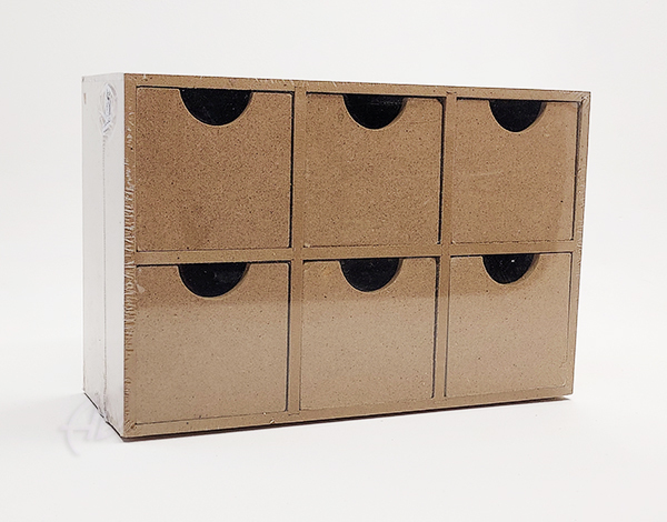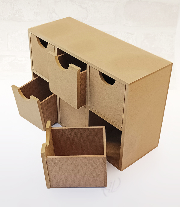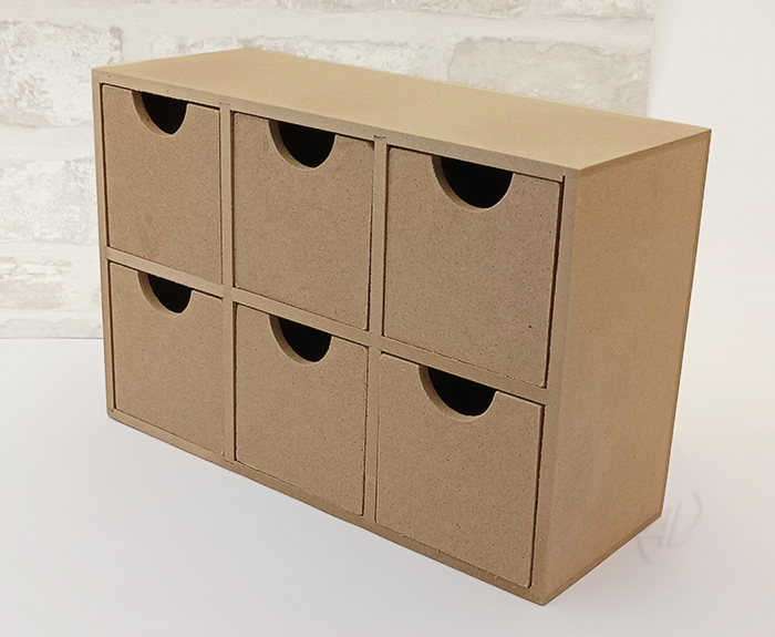 Forma pudełka - szafeczka z 6 szufladkami, może posłużyć do przechowywania rozmaitych drobiazgów, po ozdobieniu idealna na prezent.